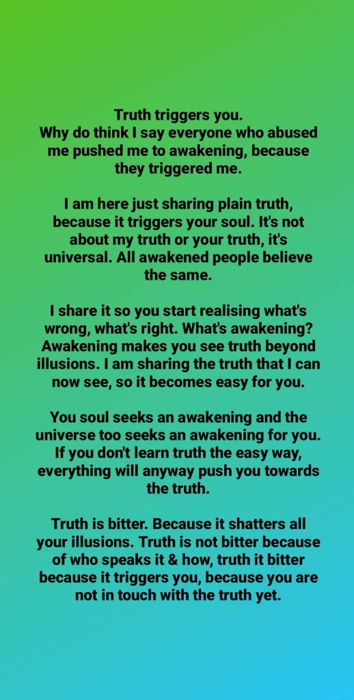 Truth hits your soul. Truth triggers you. Truth shatters your illusions. Truth remains the same, no matter how it’s said, with anger or calm, with aggression or with grace, in wars or in peace. What I share is Spiritual truth, divine truth. It’s not your truth or my truth, it’s universal. It’s going to trigger you if you are not in touch with the truth. You don’t like it because it triggers you to do shadow work. That’s exactly spirit wants to achieve, to help your soul grow. Your ego does not like it, because it triggers you. But your soul has been waiting to be triggered, so that it can heal and grow and move towards awakening.
